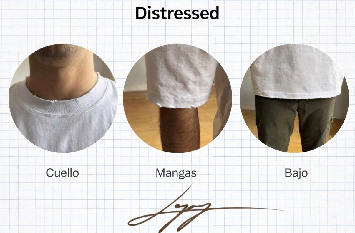 - Posibilidad de desgaste hecho a mano en cuello, mangas y cintura
